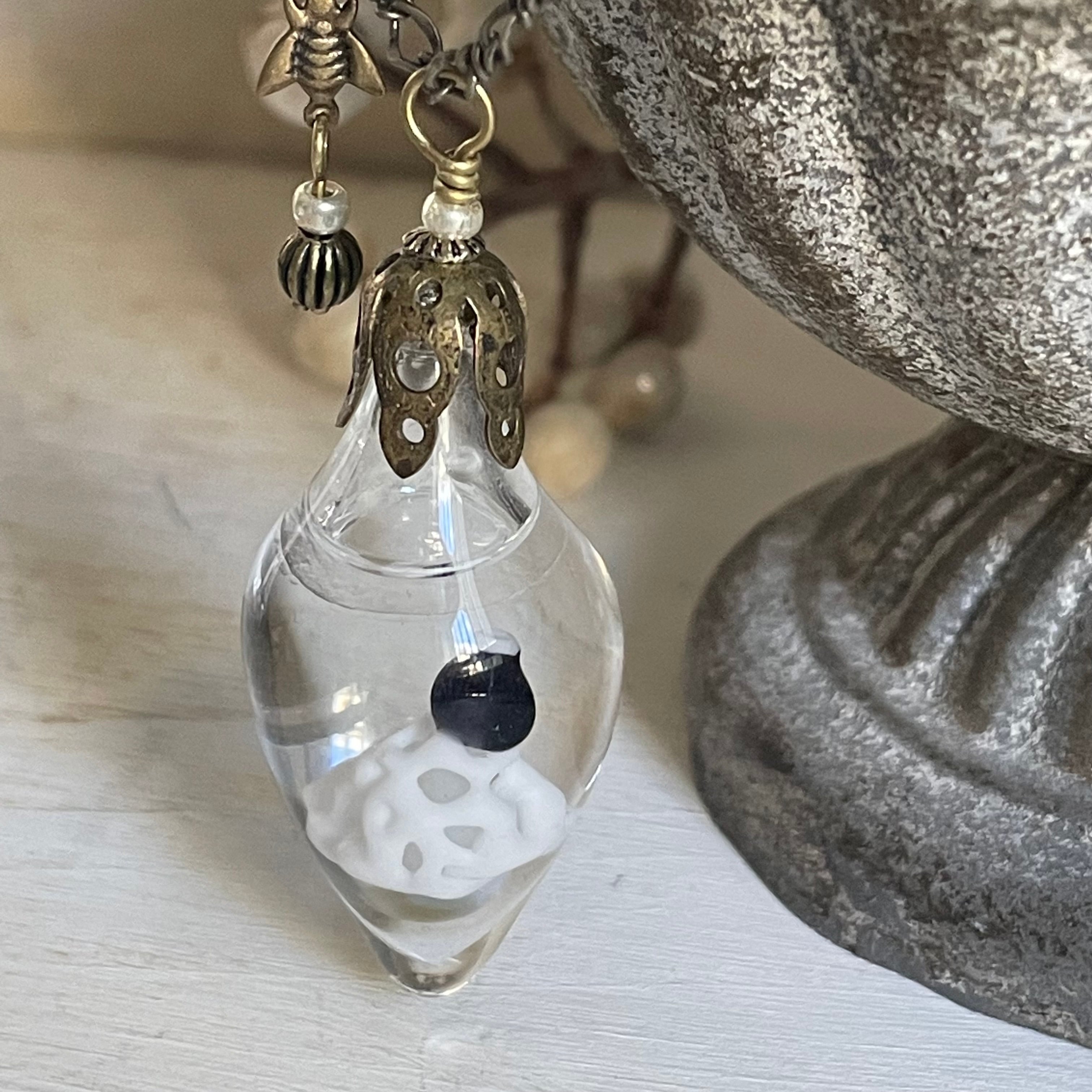 キノコ刈りの朝は早く、天気管の結晶を朝もやに見立てて制作いたしました。そして、キヌガサダケは昼には萎んでしまうのだとか。レーシーでエレガントな美しい姿に憧れがあります。いつの日か本物と出会ってみたい!という、強い願いを込めて制作いたしました。 トップ長さ4.5cm×幅1.8cm チェーン長さ45cm+アジャスター6cm